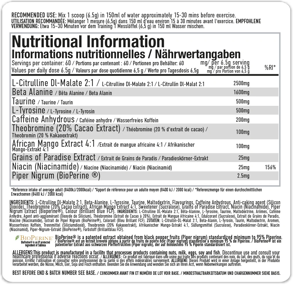 Съдържание : L-цитрулин DL-малат 2:1, бета-аланин, L-тирозин, таурин, малтодекстрин, ароматизанти, безводен кофеин, антислепващ агент (силициев диоксид), теобромин (20% екстракт от какао), екстракт от африканско манго 4:1, подсладител (сукралоза), екстракт от райски зърна, ниацин (ниацинамид), екстракт от черен пипер (Bioperine®), оцветител (брилянтно синьо FCF).