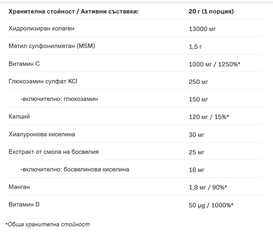 Съставки: хидролизиран колаген, малтодекстрин, метил сулфонилметан (msm), регулатор на киселинността: лимонена киселина, витамин c (L-аскорбинова киселина), ароматизант, глюкозамин сулфат 2kcl [от ракообразни ], калциев карбонат, стабилизатор: акациеви влакна, оцветители: каротени, натриев хиалуронат, екстракт от босвелия (boswellia serrata), манганов диглицинат, подсладители: сукралоза, витамин d (холекалциферол)